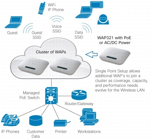 employees on a single WAP321. With Single Point Setup, the wireless LAN can scale up to a total of eight WAP321